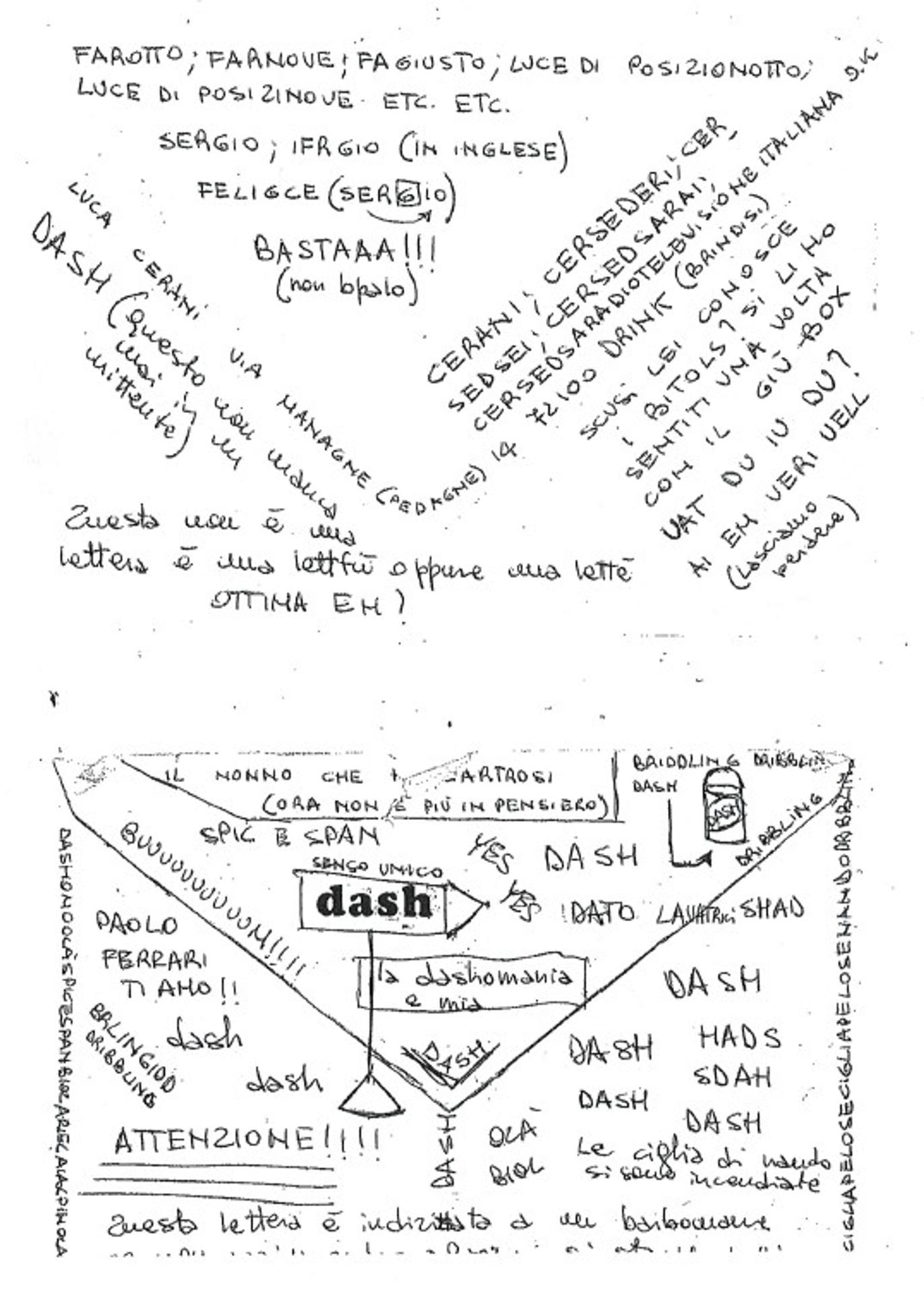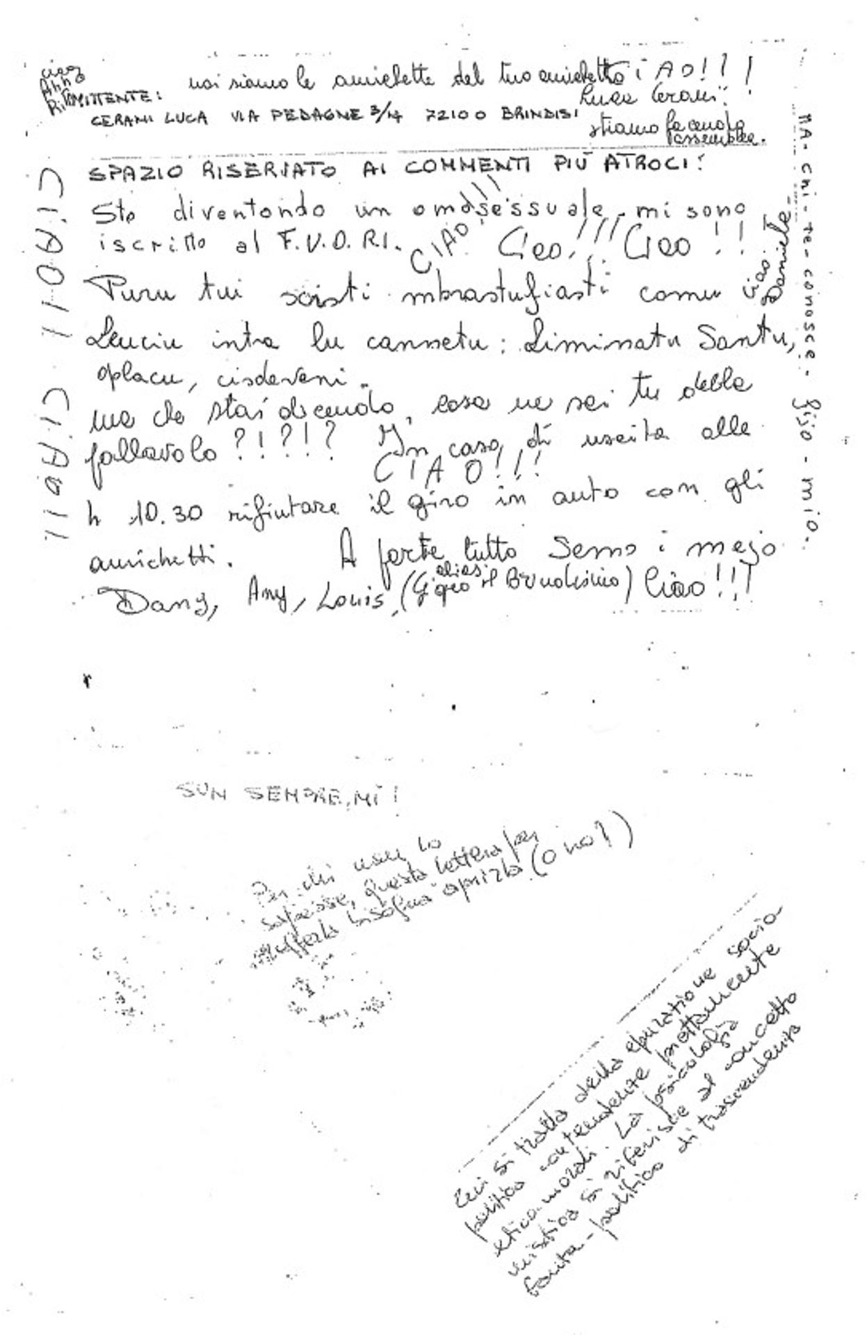 Stamattina ho fatto lo scritto: che ca .. ata. Facilissimo. Era una traduzione di Cornelio Nepote cheparlava di un certo Cabria; cose che non facevo dalla 1 ° liceo. Comunque meglio così. Devo aver fatto 1 errore, dato che poi a casa ho telefonato alla professoressa dove piglio lezioni e mi sono fatto dire la traduzione. L'orale ce l'ho mercoledì alle 9. Ma ora che lo scritto è andato bene, sono ottimista e fiducioso. In qualsiasi caso ho un casino di cose da fare x l'inizio della scuola: 60 esercizi di matematica! Frasi di inglese; ancora 2 libri di Cassala; 2 temi di storia; un libro dell'Alfieri e uno del Goldoni e un libro di storia dell'arte. PAZZESC. Tralasciamo la scuola. Ah, riguardo ai mini-assegni, tu, i tuoi, guardi le date e dove li emettono? Probabilmente lo fai, ma te lo volevo ricordare. Riguardo alle mie 50 e 100 L. nelle 50 mi mancano gli anni 58, 60. Nelle 100: 55, 61, 64, 71. Naturalmente se ne trovi qualcuno di questi, tienimeli: ok? Complimenti per le avventure del Taigher!! Mi fanno sganasciare dalle risa. Ricordati di fargli perdere quelle brutto vizio di mangiare merde e prendere su tutto da terra (vedi assorbenti) se no da grande sono ... acidi. Il Suty invece è bello tranquillo; non naturalmente in rulot dove, quando andiamo a fare passeggiate, continua ad abbaiare come un cane x giocare con i legni e fa il triplo di strada. Una volta eravamo su un costone abbastanza in pendenza quando ho calciato un sasso per caso giù e sto cretino è sceso rotolando sino a valle x prenderlo (a valle intendo lì a 200 metri. non quasi in pianura padana naturalmente) Non ti avevo detto di quante more cioè mirtilli avevamo trovato su là: tremendo. Da star lì 4 ore per prendere le più grosse: che dire! Pazzesc. Anche mia madre ne ha portate giù, ma la fregata è che le ha messe sotto il uischi per intenderci: bleah!!! Non che le ha pressate sotto una bottiglia di uischi né?! Le ha messe cum uischi, bleah, rovinate! Sei sicuro che invece del granellino di sabbia (se mai granellose) non ti sia entrata una pallina da pingete pong (è il ping pong) nell'occhio. A proposito di film (non c'entra niente con quello che ho scritto, È solo che sto leggendo la tua lettera). Ho visto un borghese piccolo x 2 cioè piccolo piccolo: bestiale. Se passa da Brindisi sgranate gli occhi perché è talmente piccolo che può passare inosservato! Vallo a vedere: ti conviene. Tu che altri film sei andato a vedere? A proposito di mini-assegni: ricordati che mi devi sempre 50 LIRE IN PIÙ DEL COSTO NORMALE: 50 LIRE HO DETTO, E NON FREGARMI, HAI CAPITO GONZONE!! Ex i migliori anche 100 lire, ok? Effettivamente Varicella cioè gulp ... cazz Cartella stopp(o) ... CIOÈ NO MARCELLA INSOMMA LEI o COME DRACULA SI STOPPA, È VERAMENTE UNA RAGAZZA SIMPATICA E ANCHE ABBASTANZA CARINA: INSOMMA, DEVO FARTI I MIEI COMPLIMENTI X LA TUA SUPER CONQUISTA, O È LEI CHE TI HA CONQUISTATO, O VI SIETE CONQUISTATI INSIEME, IMPOSSIBILE UNA ATTACCA E L'ALTRO DIFENDE, MA CHE DICO, PER TUTTI I MAIALI IMPORTIFITI DEL TIMBUKTU! SENZA SCHERZARE, DAGLI UN BACIONE DA PARTE MIA DOVE VUOI TU (NON FARE IL PORCELLONE EH) PAZIENZA SE NON VERRAI A MILANO. PECCATO. IN QUALSIASI CASO VEDREMO X I MORTI, CIOÈ I SANTI ETC CHE VACANZE Cl SARANNO, SPERO TANTE, DAI VADO SUBITO A VEDERE. BENE, DOVREBBERO ESSERE QUASI UNA SETTIMANA, MA NON Ml RICORDO SE HANNO ABOLITO QUALCOSA. LA SCUOLA INIZIA AL 20 SIGH.